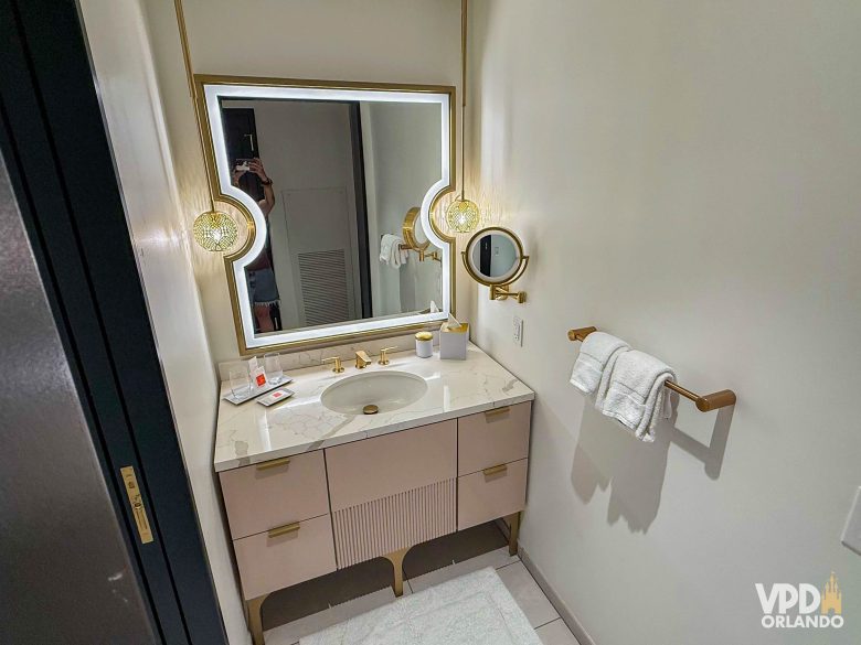 Em frente ao armário fica o banheiro, que é dividido em 2 ambientes, um com pia e outro com vaso sanitário e o chuveiro. A área da pia é super bonita, com cores que combinam com o restante do quarto, gavetas fundas, produtinhos, um ótimo secador e muitas toalhas. Além de um espelhão bem iluminado, tem também dois lustres pequenos lindíssimos.